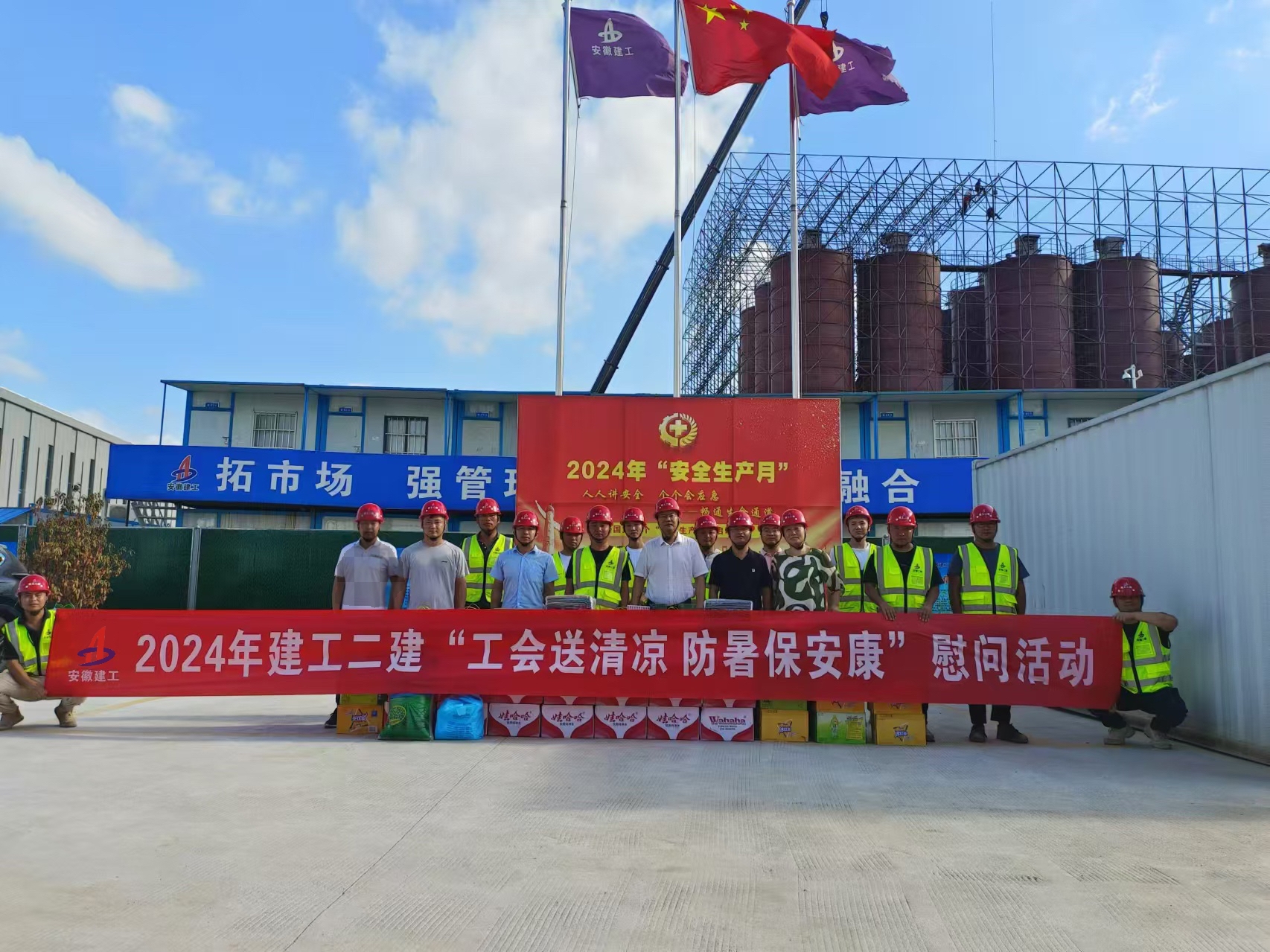 驕陽似火,酷暑難耐,為做好職工防暑降溫工作,有效防控高溫中暑事件和安全生產(chǎn)事故的發(fā)生,切實(shí)維護(hù)廣大職工的勞動(dòng)安全和健康,7月25日,建工二建黨委副書記、總經(jīng)理陶良敬赴安徽建工(蕪湖)新材料智能智造產(chǎn)業(yè)園項(xiàng)目開展送清涼慰問活動(dòng)。建工建材蚌埠建材公司副經(jīng)理邵亞飛參加慰問活動(dòng)。