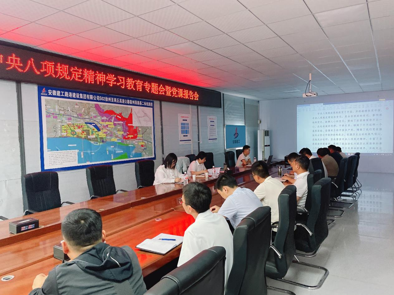 近日,宿州投發(fā)機(jī)關(guān)黨支部書記徐晶晶一行先后赴S02徐商高速路基二標(biāo)項(xiàng)目部、S02徐商高速路基一標(biāo)二分部項(xiàng)目部,開展深入貫徹中央八項(xiàng)規(guī)定精神學(xué)習(xí)教育專題會暨黨課報告會。機(jī)關(guān)黨支部書記徐晶晶講授黨課,黨支部委員陸冬領(lǐng)學(xué)相關(guān)內(nèi)容,項(xiàng)目部全體職工參加會議。