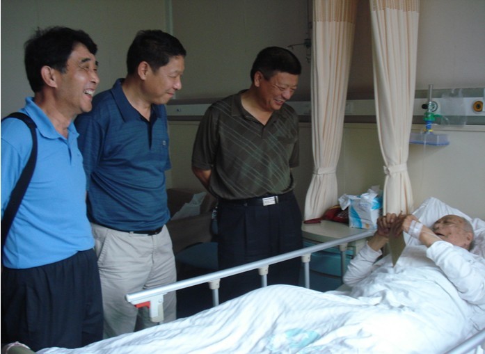 圖為公司黨委書記朱治淮(右一)、工會主席李林(右二)在省立醫(yī)院看望老干部劉弘毅
