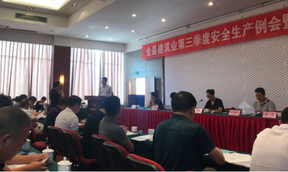 岳西縣建筑業第三季度安全生產例會于2019年9月12日上午在天際大酒店召開,安徽二建一分公司承建的安徽潤業國際電商產業園項目獲評岳西縣第三季度“最優工地”,項目經理王偉翔到會發言并參與交流。
