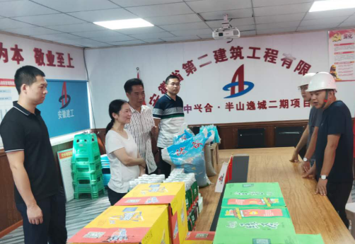 分公司支部書記倪海霞、生產經理崔俊等人組成“送清涼”工作小組,頂著高溫炎熱,來到四川巴中興合半山逸城二期項目部,為堅守在施工一線的勞務人員送去飲料、毛巾等各類降暑物品的同時,送去了公司的關懷和溫暖。
