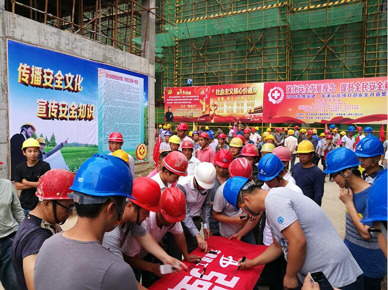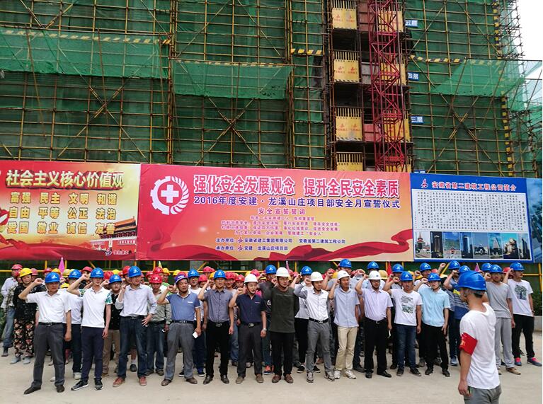 “我是一名安徽建工人,我鄭重宣誓:時刻注意安全,遵守安全法規(guī)。履行安全職責(zé),提高安全技能。杜絕三違現(xiàn)象,保證四不傷害。強化紅線意識,促進(jìn)安全發(fā)展……”。嘹亮的宣誓聲響徹整個施工現(xiàn)場,震撼人心。6月1日早晨7:00,在宿松安建·龍溪山莊工程施工現(xiàn)場,由業(yè)主、監(jiān)理及安建·龍溪山莊項目部員工近百人組成的宣誓隊伍莊嚴(yán)宣誓,并簽字承諾,借此拉開“安全生產(chǎn)月”活動序幕。