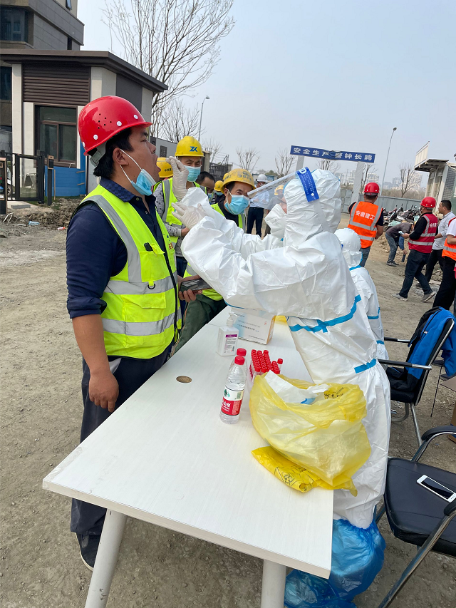 為配合做好核酸檢測工作,項目青年志愿者在現(xiàn)場維持秩序、設置點位、劃分區(qū)域,按10人為一組配合醫(yī)護人員采集咽拭子。醫(yī)護人員身著防護服、頭戴護目鏡,快速精準地為項目管理人員和一線工人采取樣本,并進行信息登記。